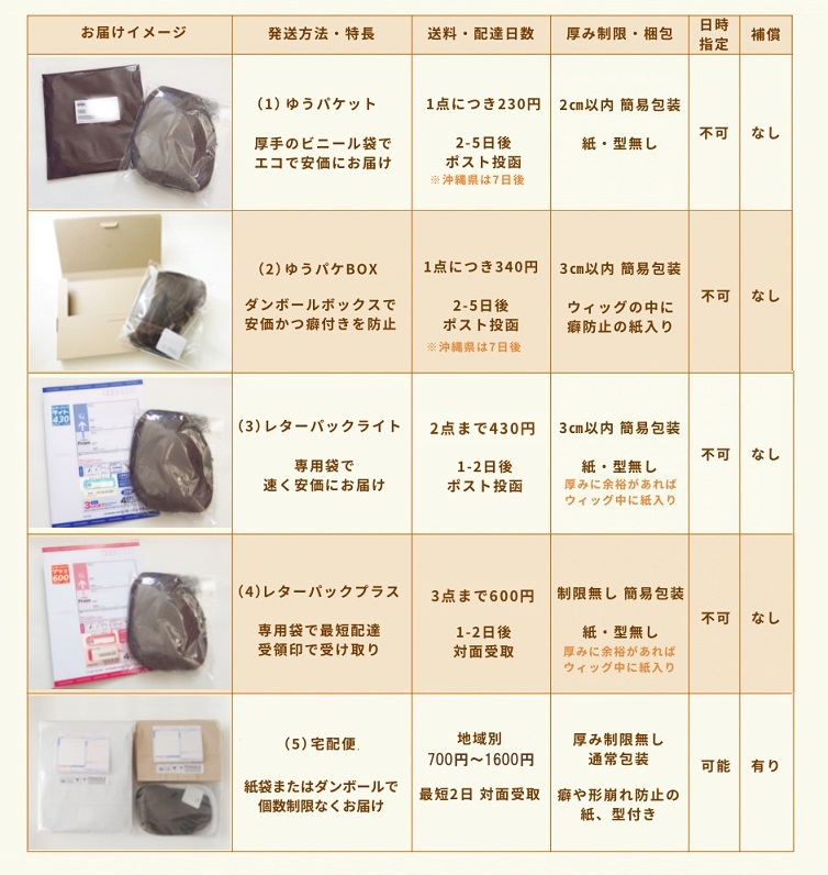 ▼例:フルウィッグ3点まで同封可能、厚みのあるケア用品も対応