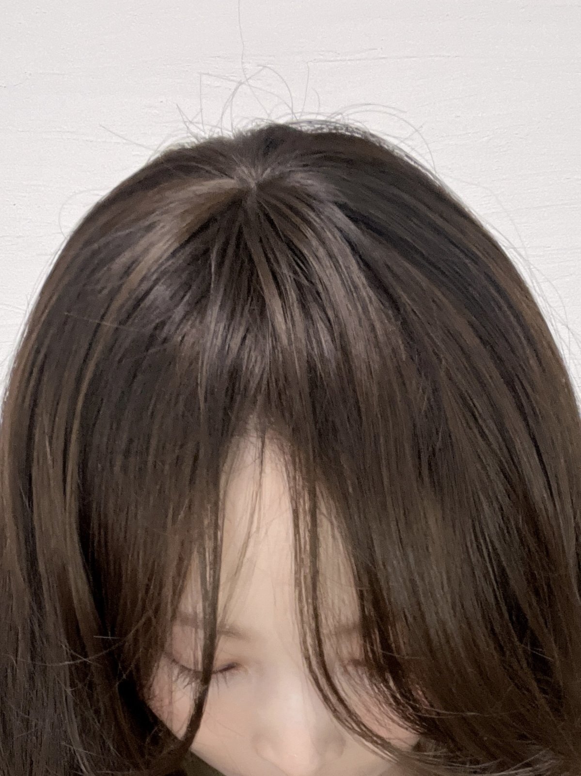 くすみ系ブラウンと透明感のあるベージュのMIX!暖かみのあるブラウンですが光に当たるとベージュの明るさが出ます。根元にダークカラーの短い毛が混ざっています。